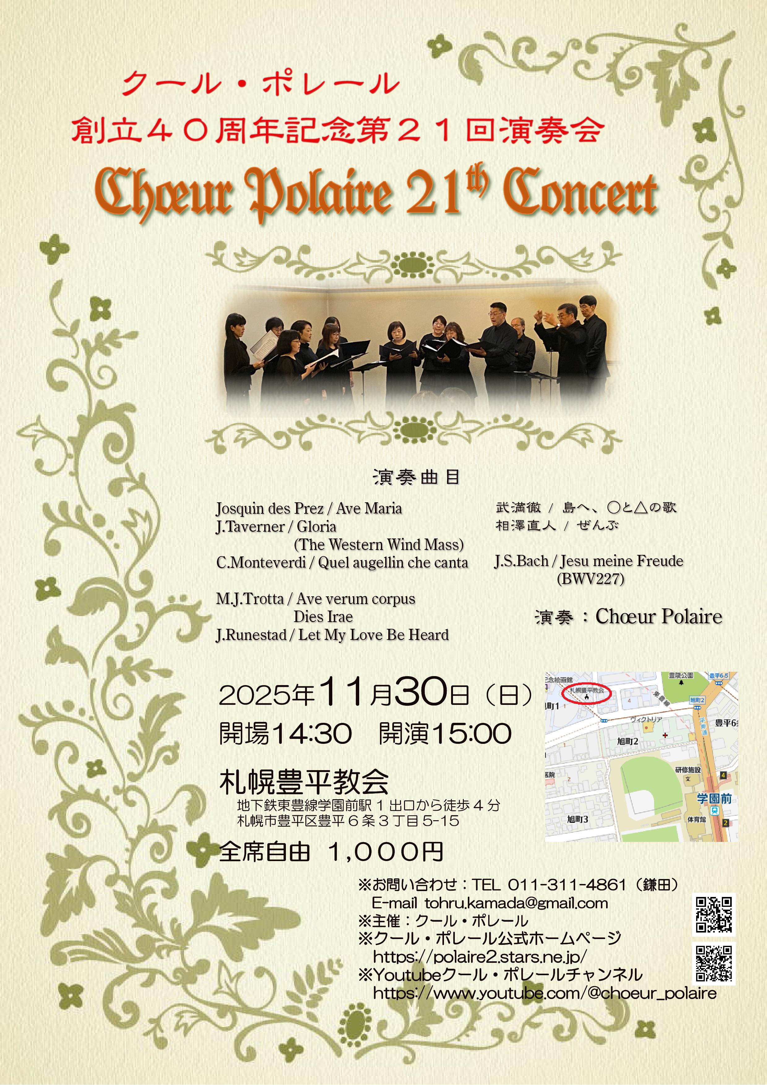 昨年の札幌バプテスト教会での演奏会後、久しぶりのホールでの演奏でしたが、ポレールの皆さんは本番に強い。ホールも大変良い響きで歌いやすかったせいもあったと思いますが、Lauridsenは各パート1〜2名という状態でしたが、やはり気持ちが入るとしっかり歌えるものですね。出演は指揮者を入れて15名でした。